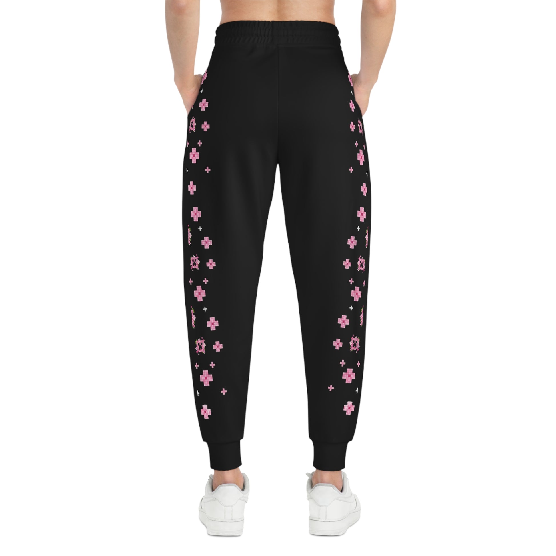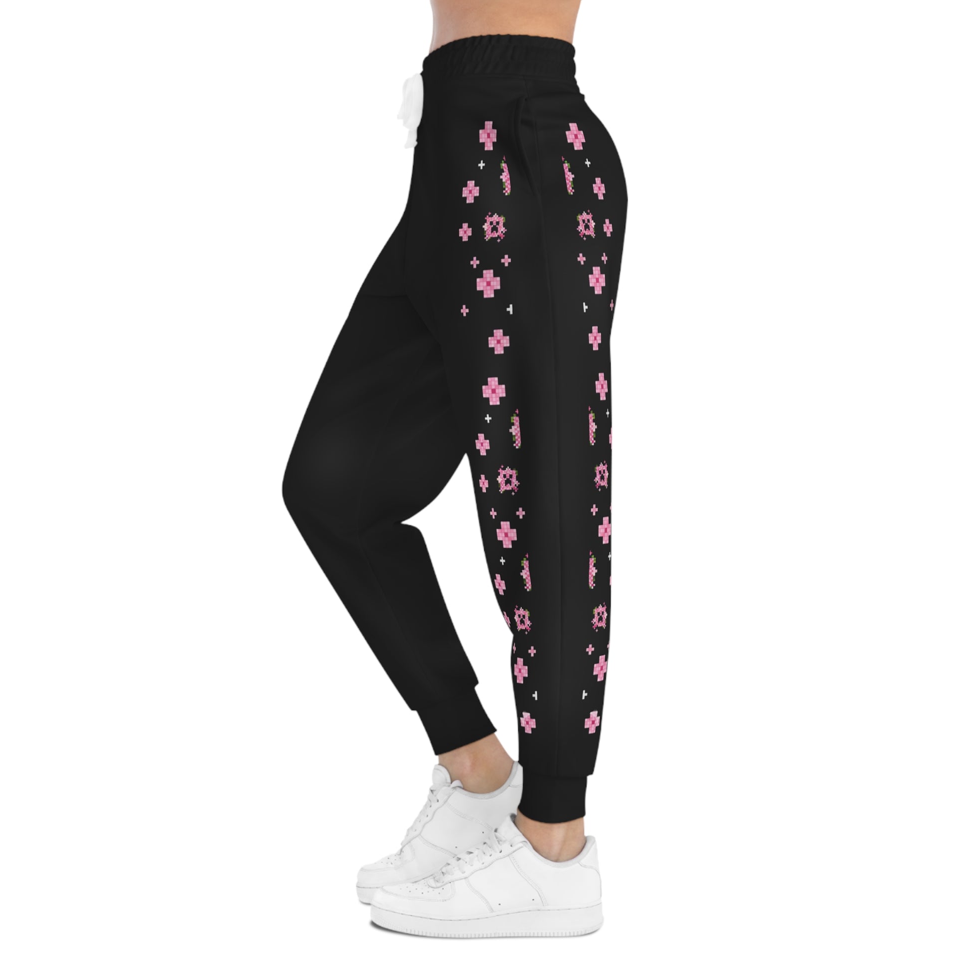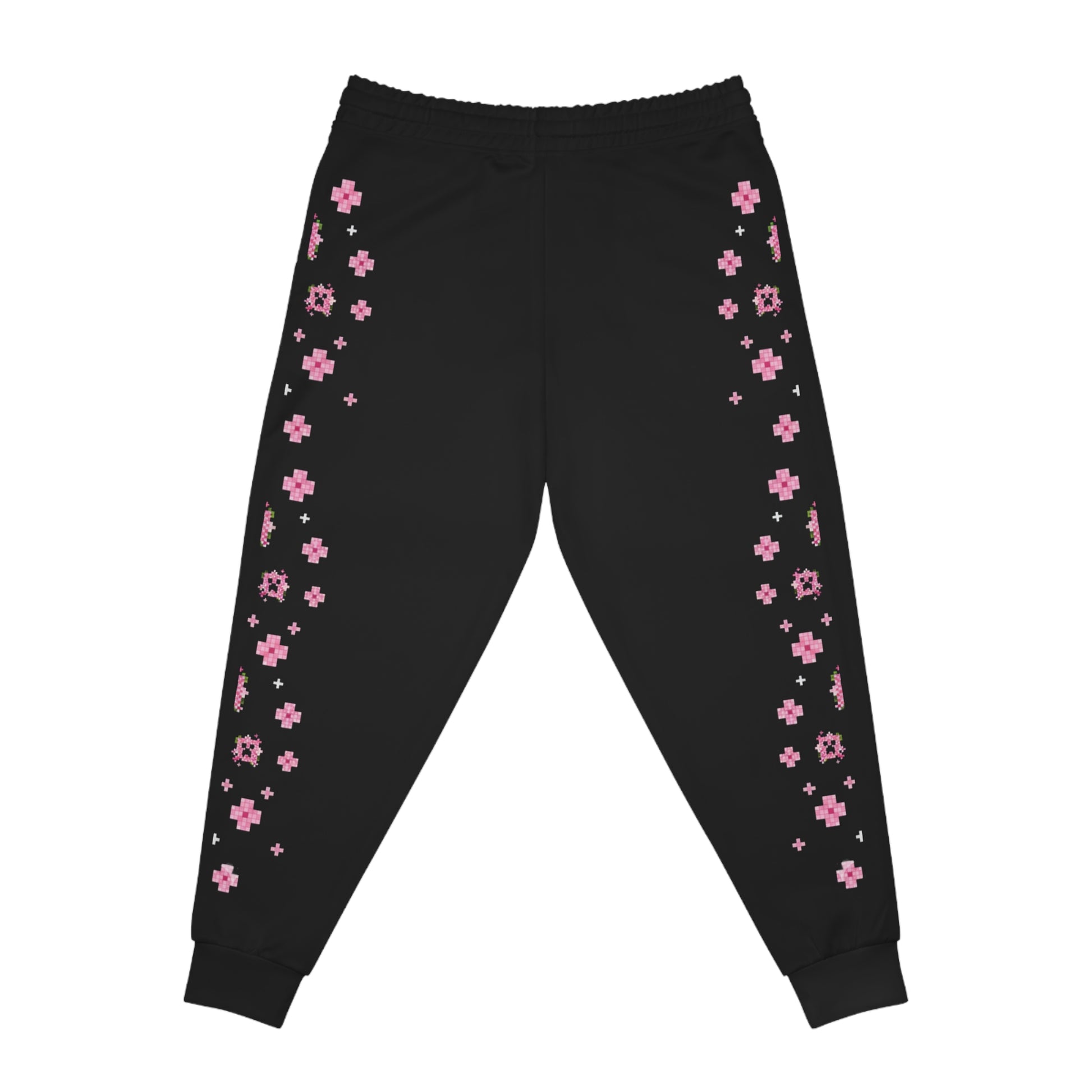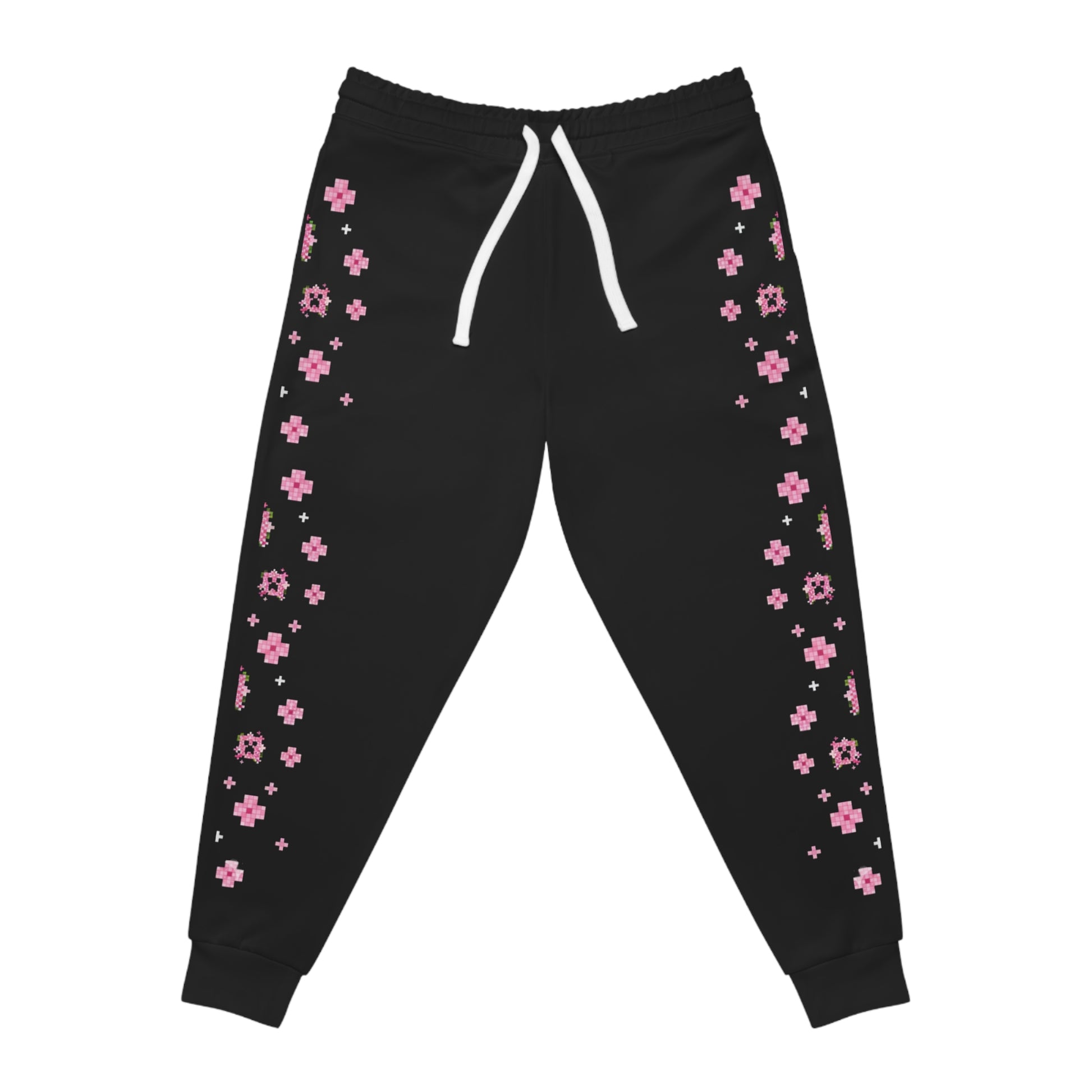 These joggers bring quiet charm to everyday movement. Soft, slightly stretchy fabric hugs the body while the all-over black provides a clean backdrop for delicate rows of pixel-inspired pink blossoms running down each leg.