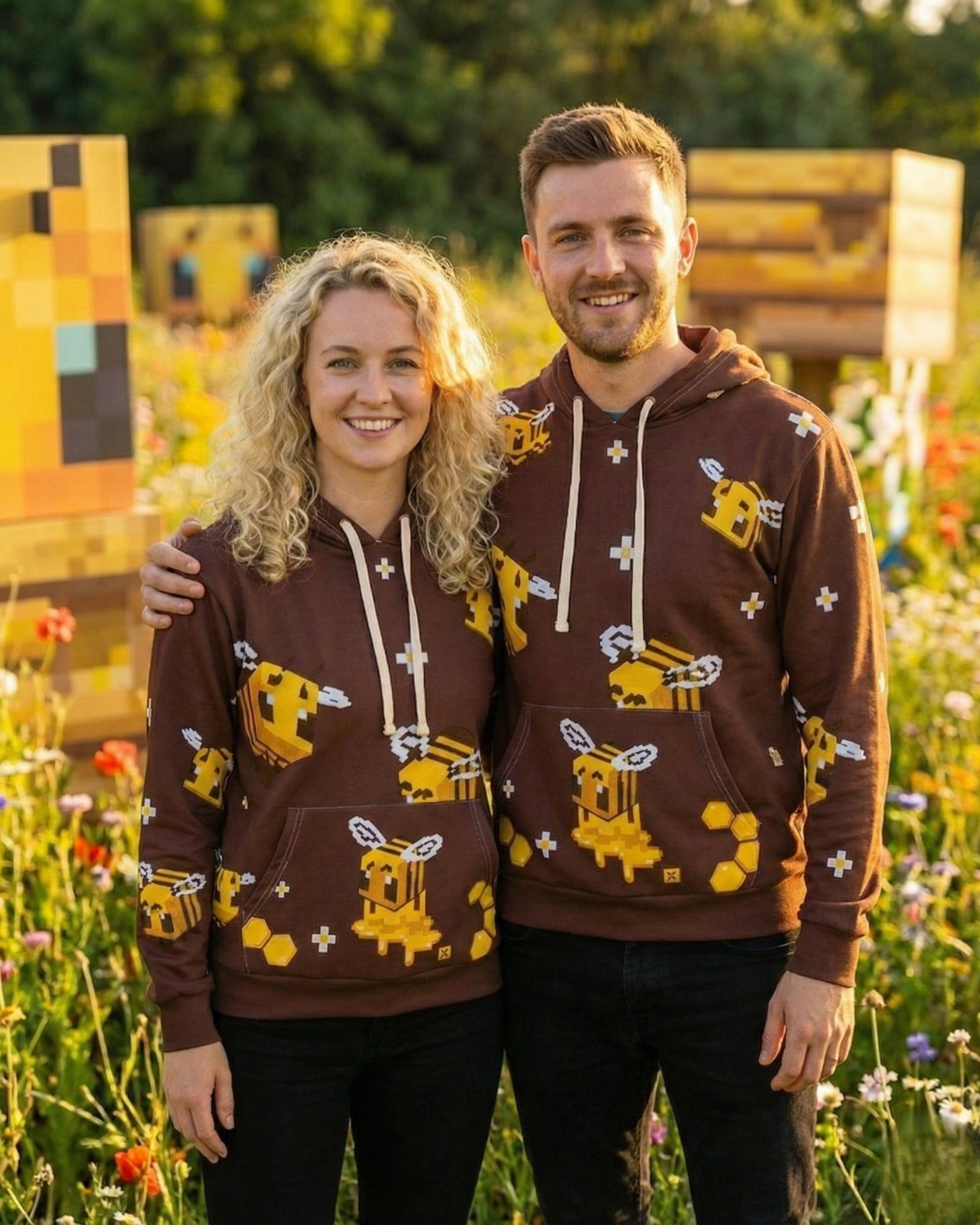 Wrap yourself in cozy, pixelated charm. This all-over print hoodie features cheerful, blocky bees and honeycomb clusters set against a warm chocolate background. The roomy kangaroo pocket and adjustable hood make it feel like a wearable comfort zone great for lazy mornings, game nights, or wandering a farmers’ market.