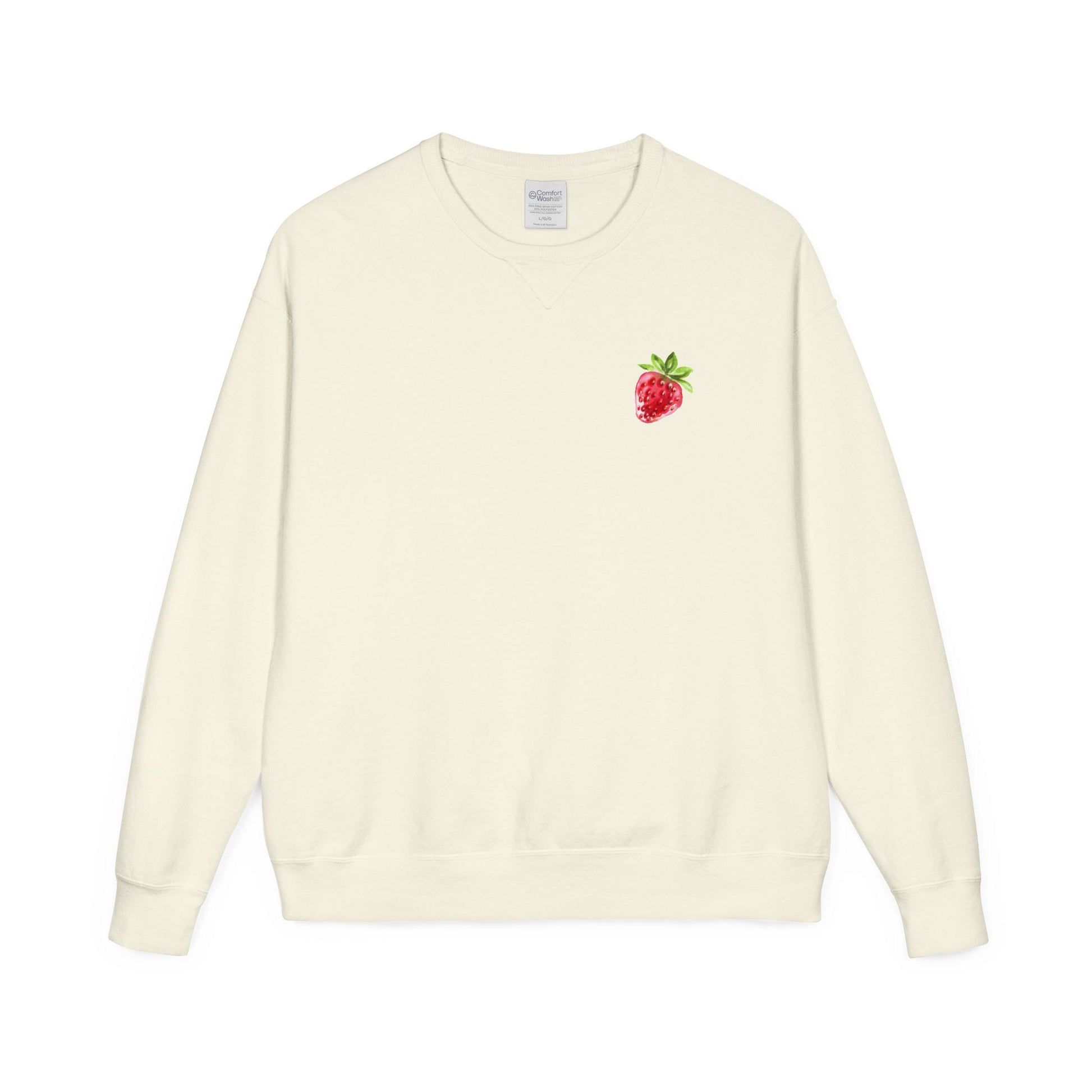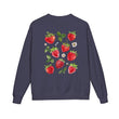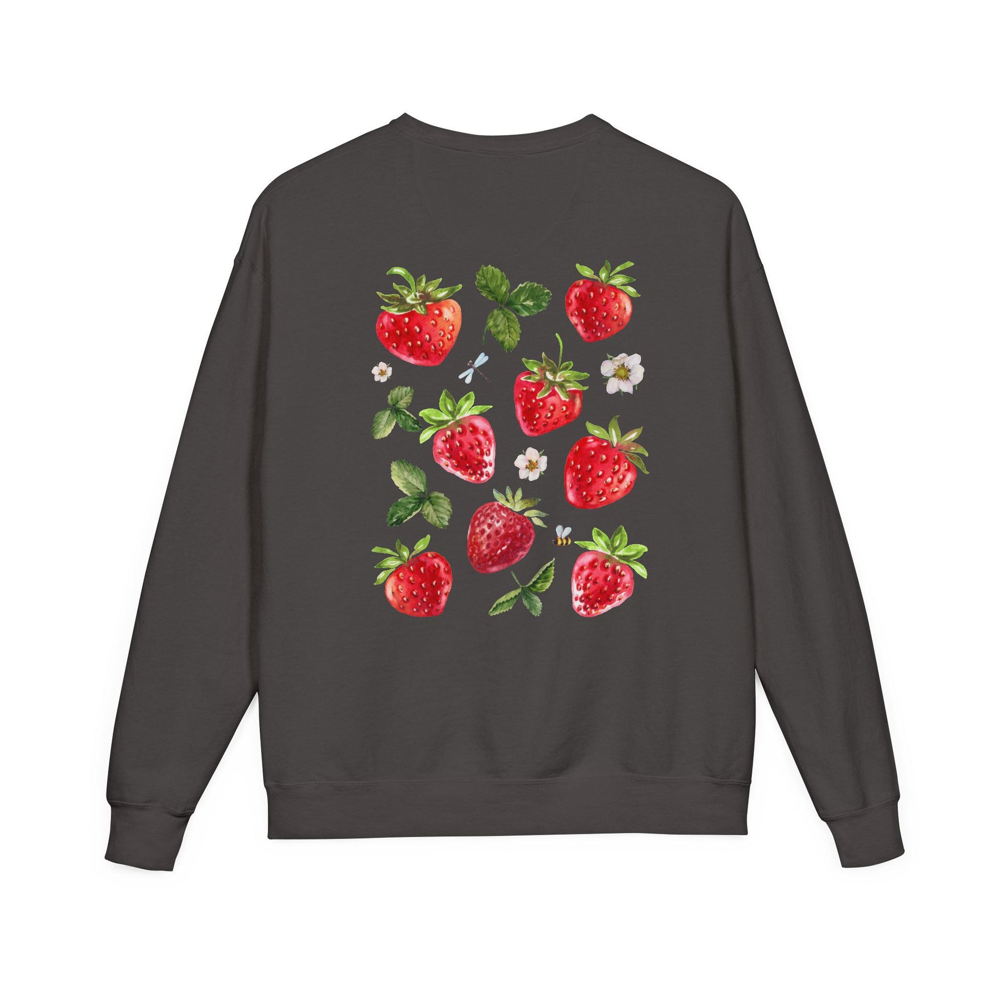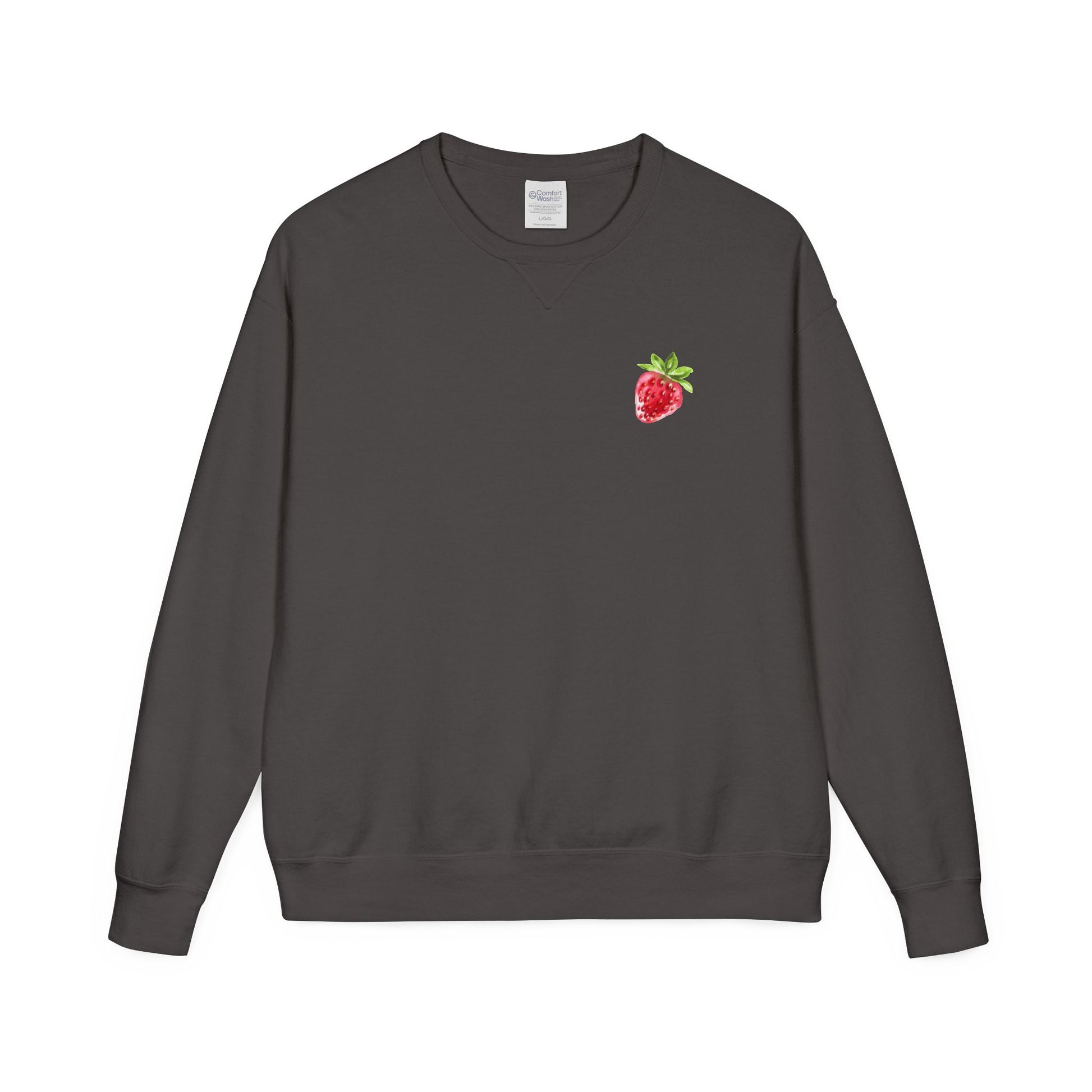 A soft, garment-dyed crewneck with a gentle vintage vibe and a scatter of hand-painted strawberries. The charcoal sweatshirt feels lived-in from the first wear midweight fleece that warms without weighing you down.