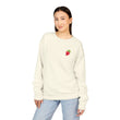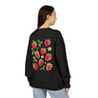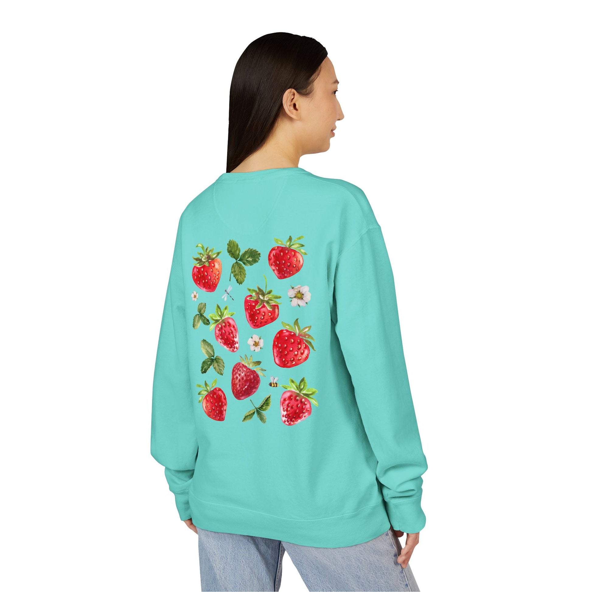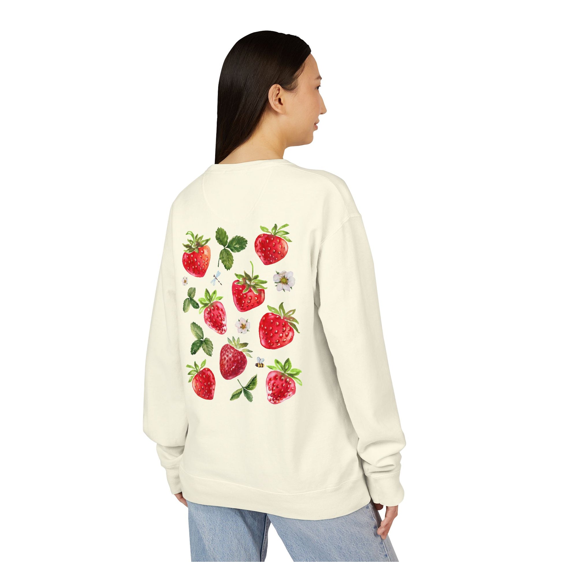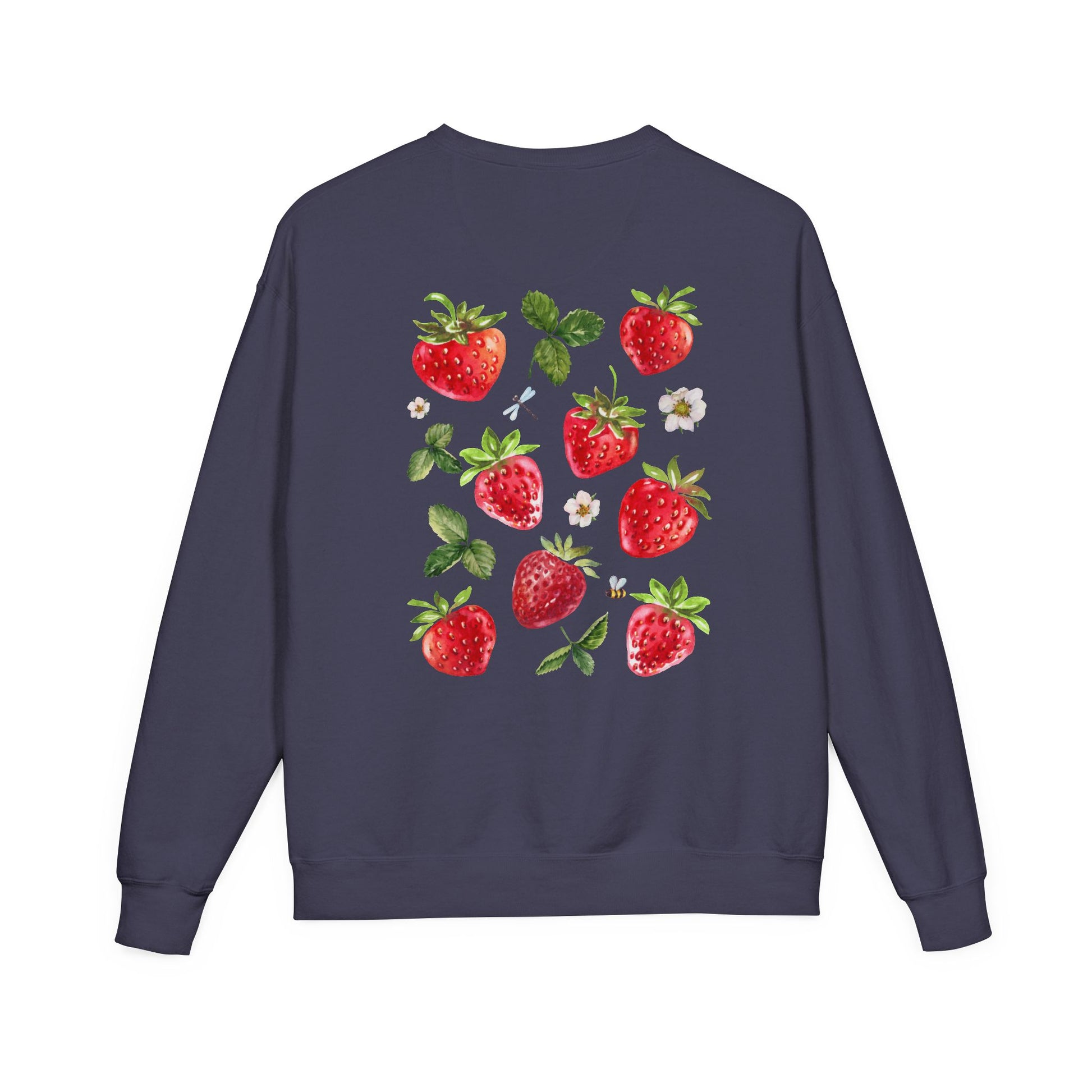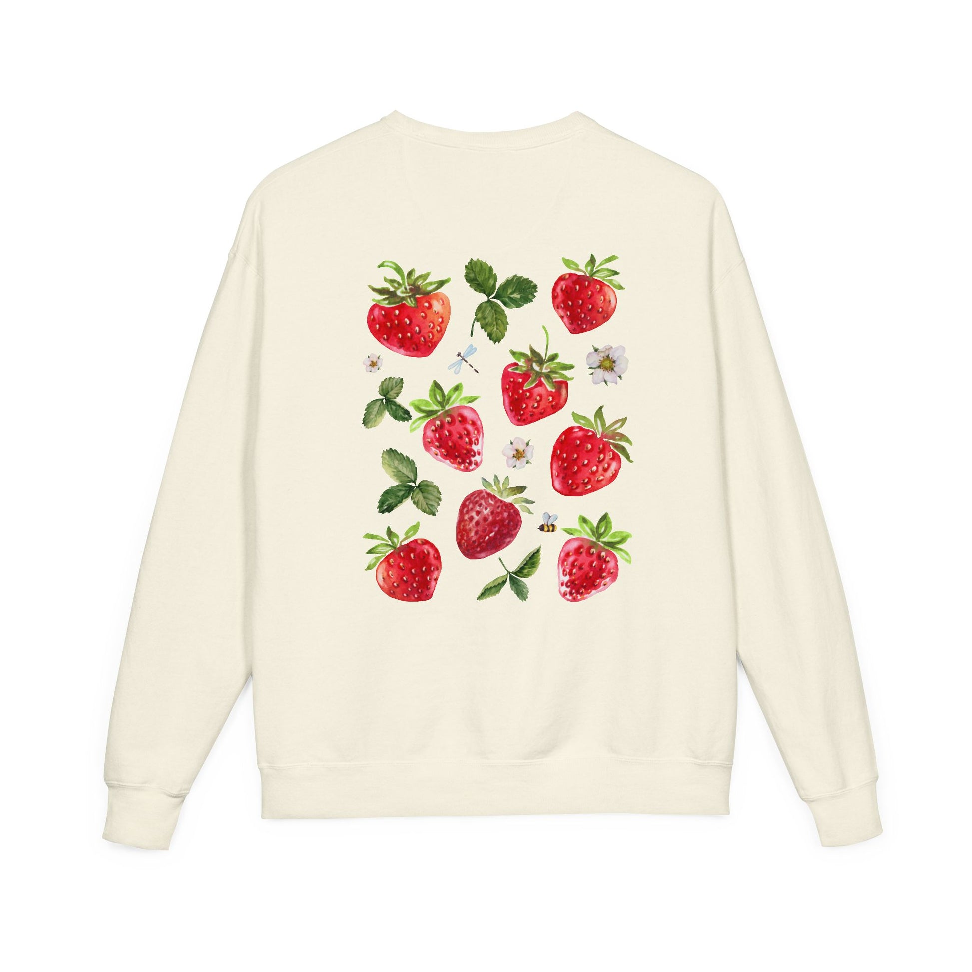 On the front, a single strawberry sits over the heart; on the back, a loose cluster of berries, leaves, and tiny blossoms brings a playful, cottagecore energy.